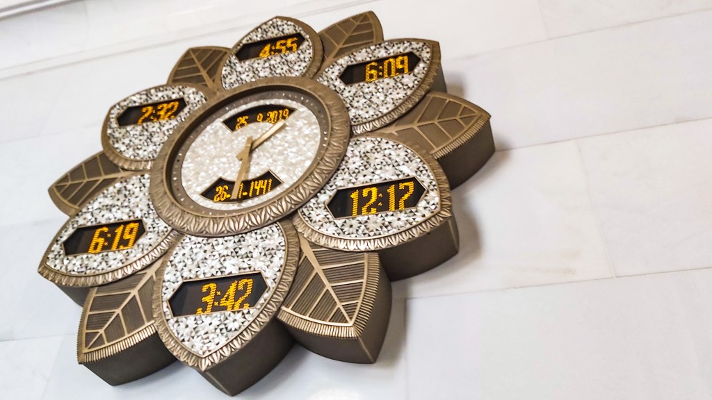 All of the Prayer times in the Grand Mosque is synchronized using GPS making sure the time is exact. It is controlled by a centralized Software from Bodet-UK that manages the Hijri Calender and Date every year. The AV system includes HD Camera for broadcasting and Large Panasonic Plasma displays to show information about various Islamic Activities.